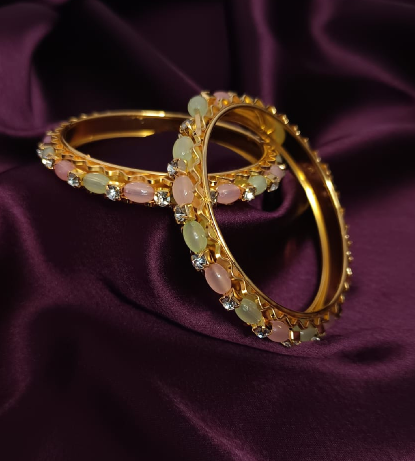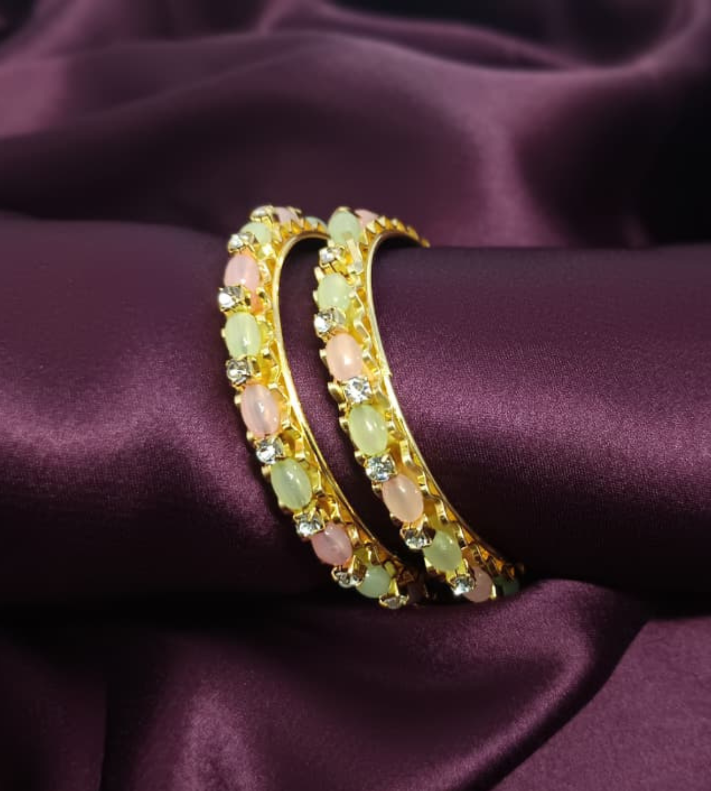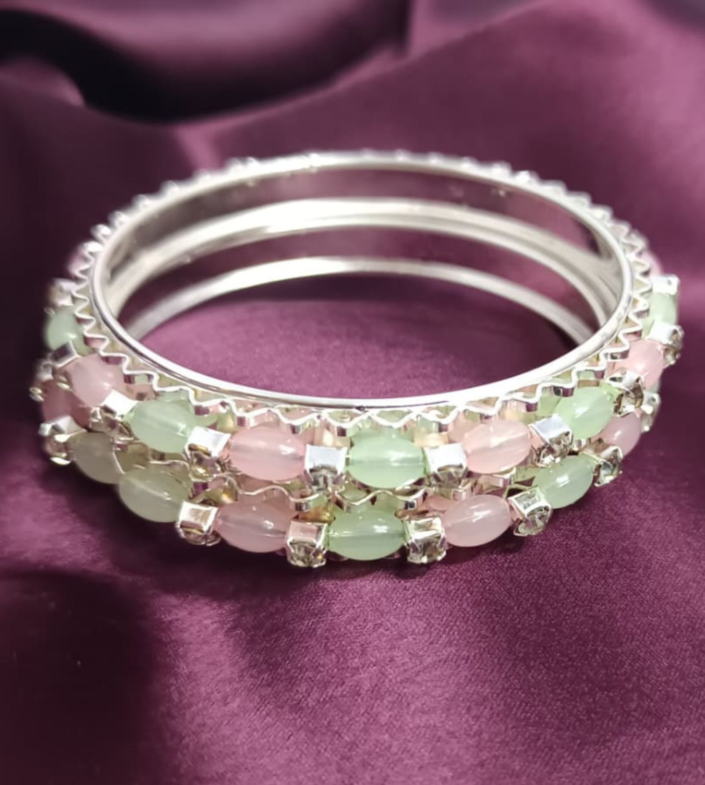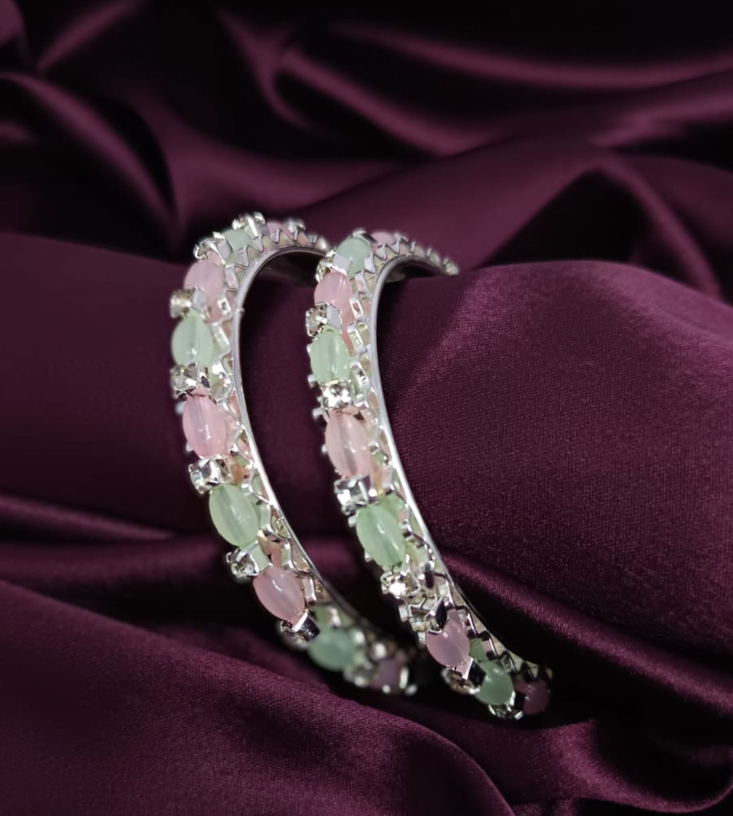 Elegant American Diamond bangles, beautifully studded with pastel pink and green stones, designed to bring charm and sparkle to every outfit. Perfect for festive occasions, parties, and daily elegance.