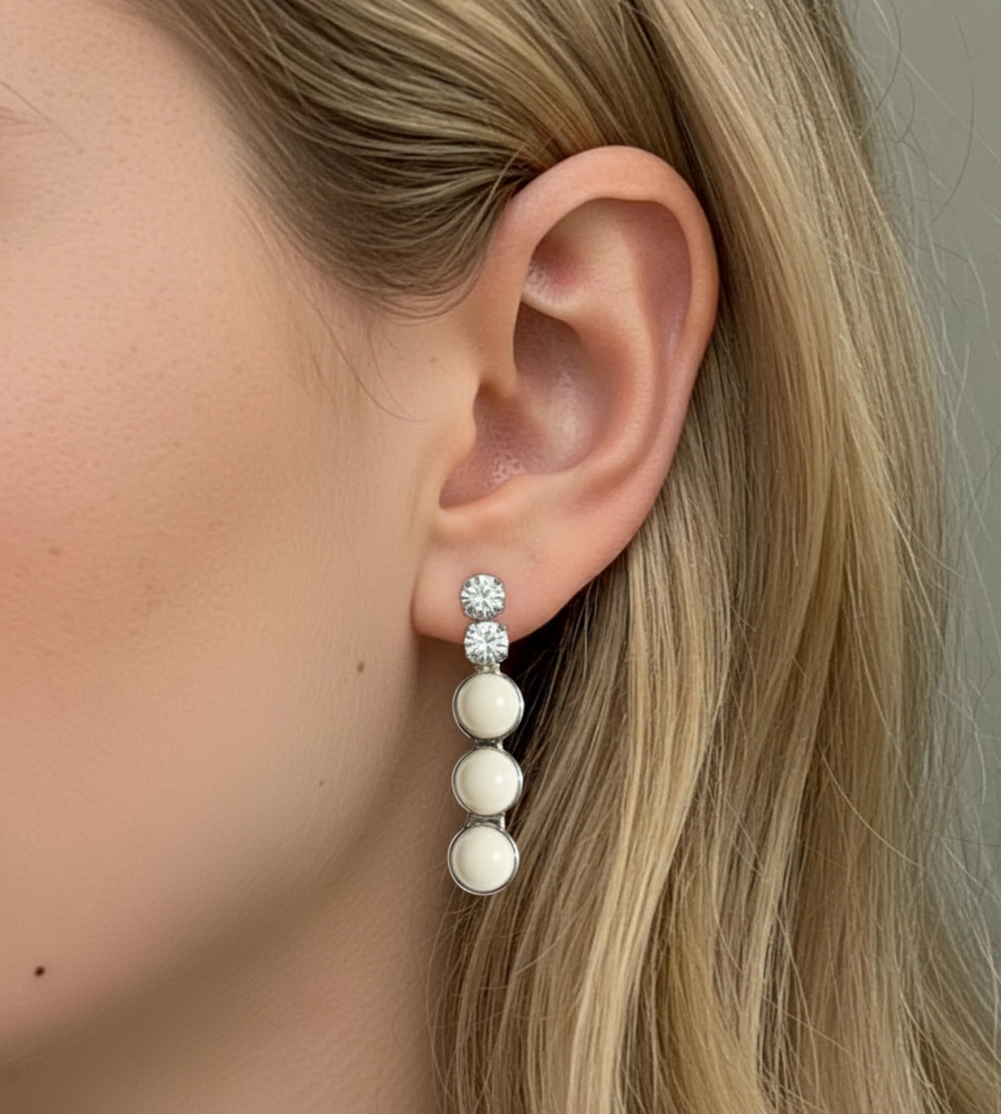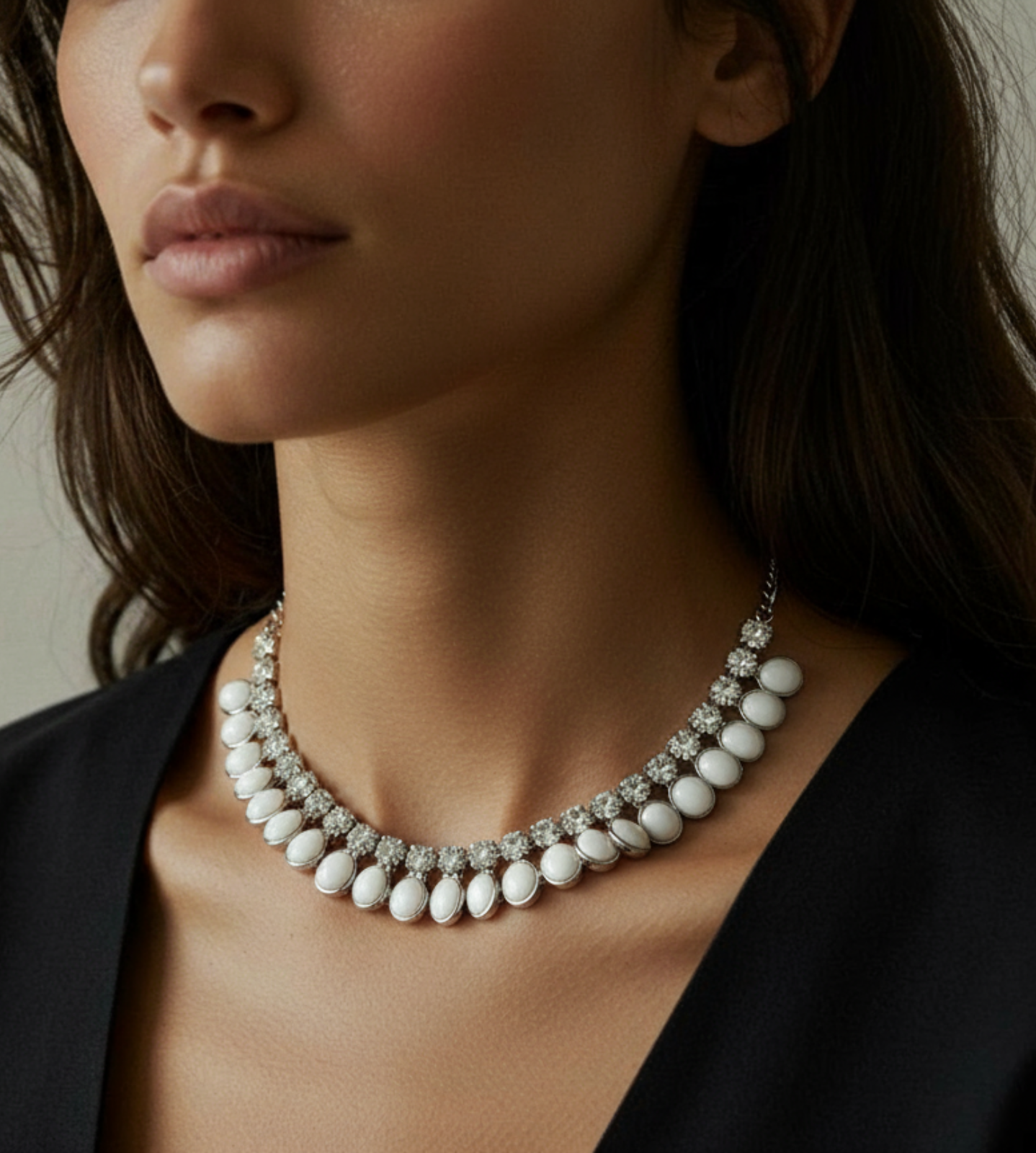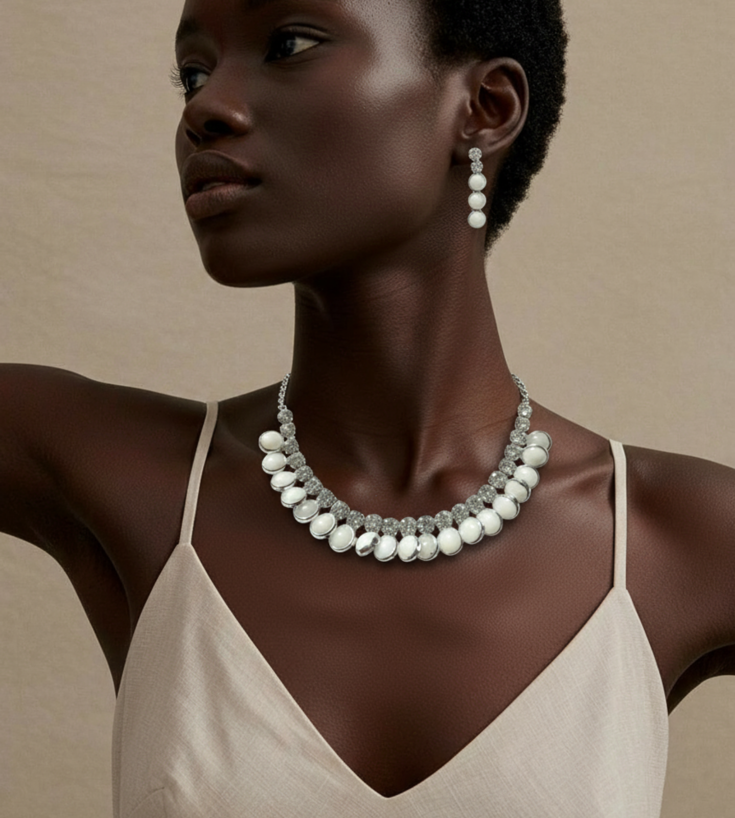 A graceful necklace and earring set featuring glossy pearl-like stones accented with shimmering crystals. Designed to add timeless sophistication, this set is perfect for weddings, parties, and elegant evening wear.